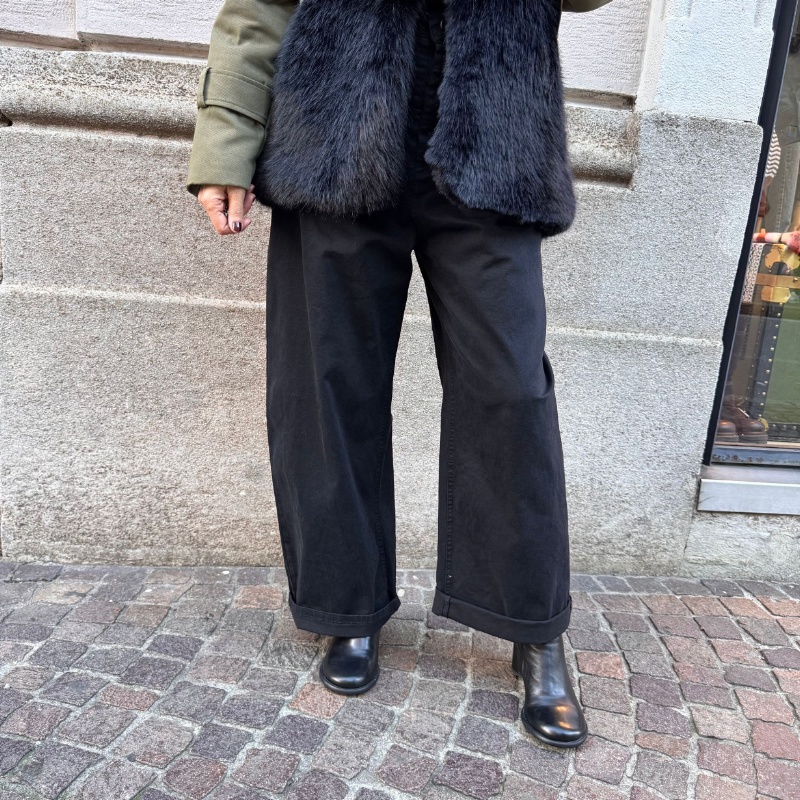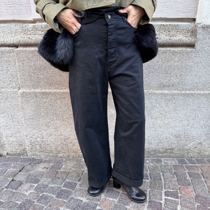 Pantalone in cotone con ampia gamba e cavallo leggermente sceso, leggermente elasticizzato