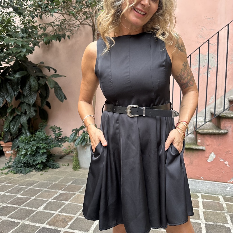 Abito corto in raso , modello smanicato con zip sul retro, cinturina inclusa, sottoveste