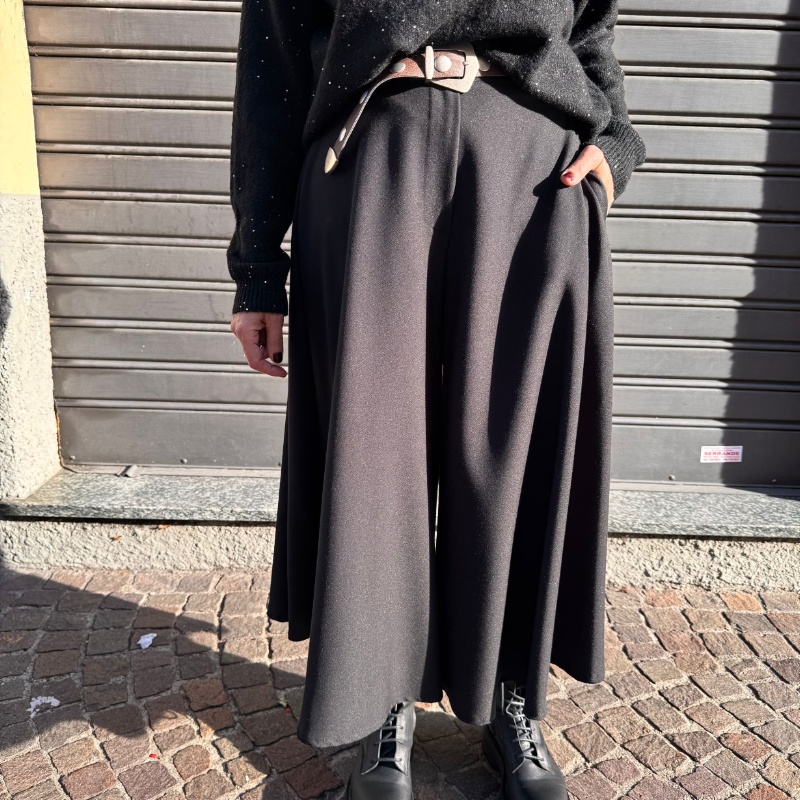 Pantalone a gamba larga con cavallo leggermente sceso, tasche laterali, accessorio incluso
