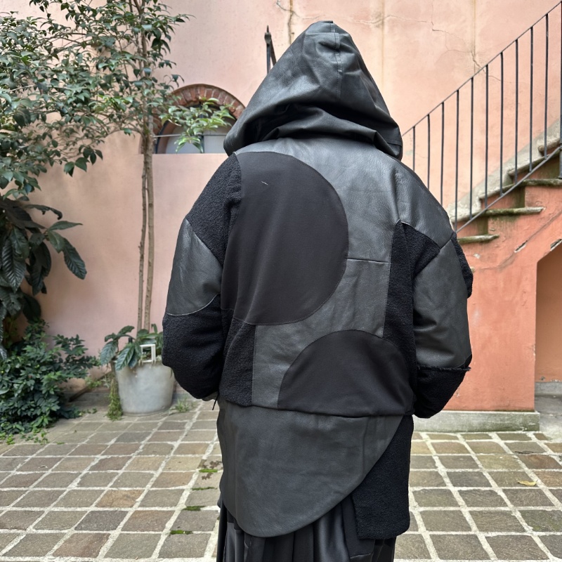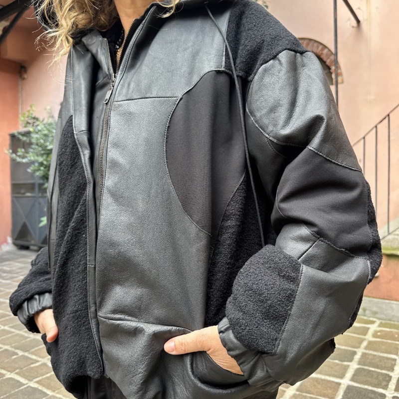 Giaccone imbottito con inserti in vera pelle, zip centrale, tasche laterali e cappuccio
