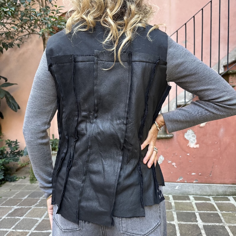 Gilet asimmetrico, modello sciancrato con allacciatura centrale, tagli vivi in pelle e tessuto