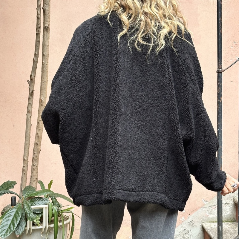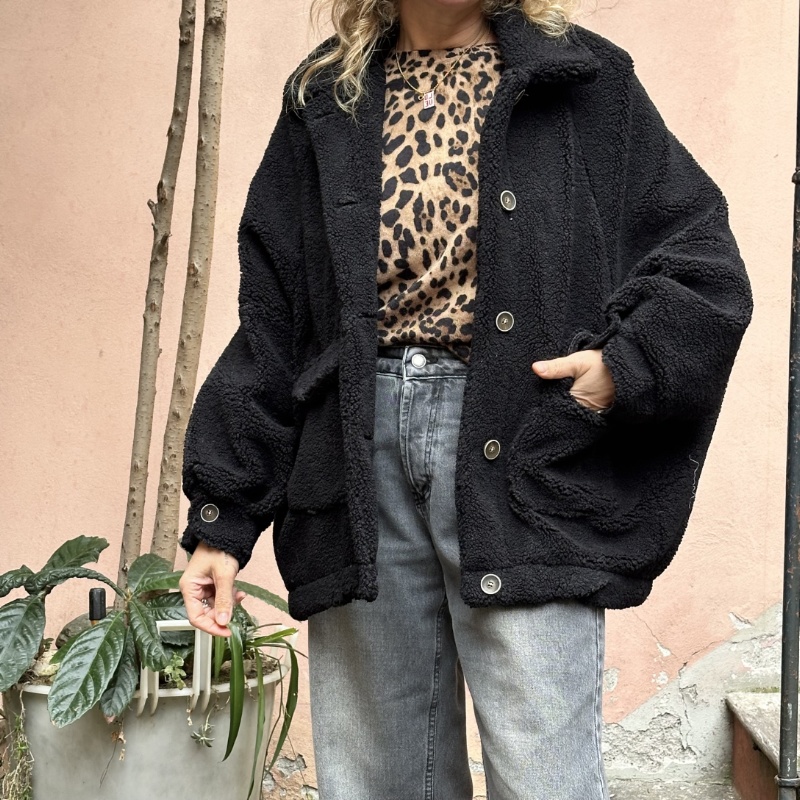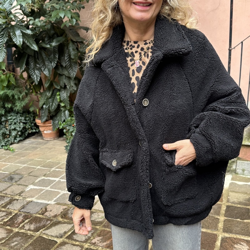 Mini Teddy con spalla scesa, allacciatura centrale, tasche applicate sul davanti e spilla staccabile