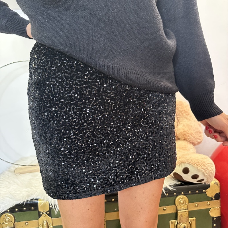 Gonna mini in paillettes base in velluto con fodera, elastico in vita