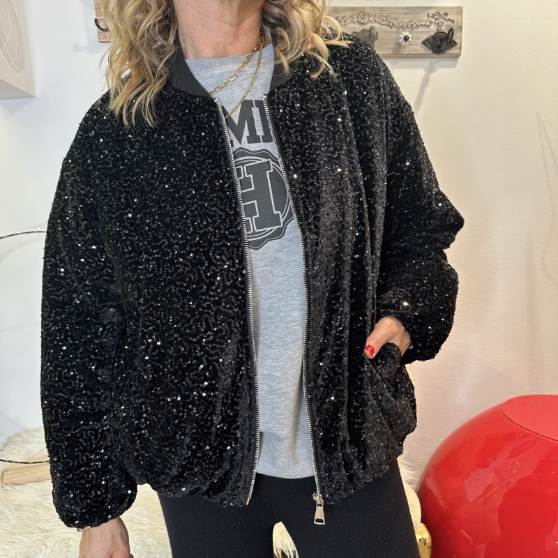 Bomber con paillettes base in velluto foderato, colletto in maglia, elastico sul fondo e polsini, tasche sul davanti, zip centrale