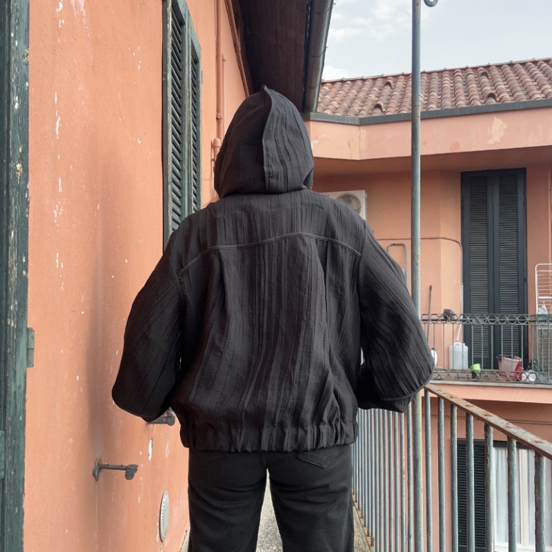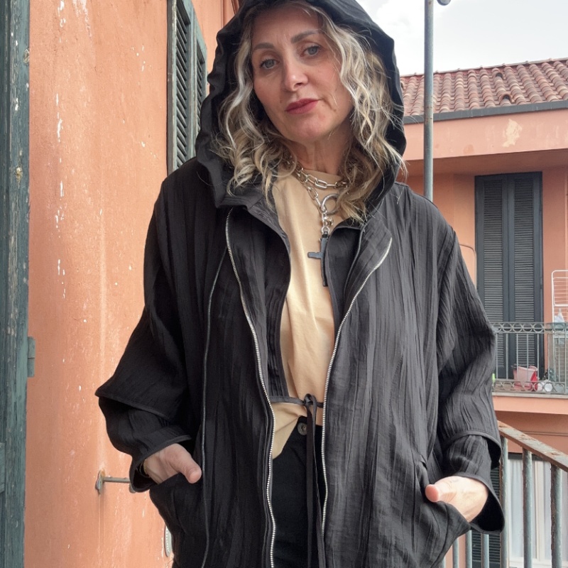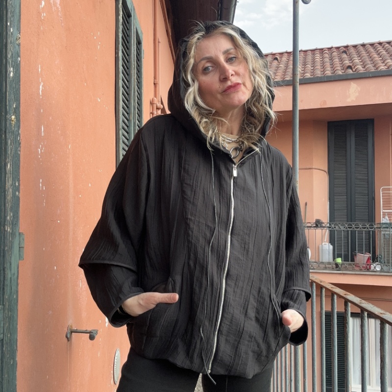 Bomber con cappuccio, modello over con zip centrale, tasche , foderato internamente , inserti in vera pelle