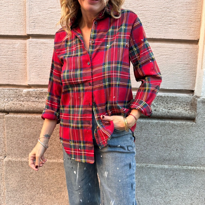 Camicia scozzese con stampa sul retro e spruzzi realizzati a mano