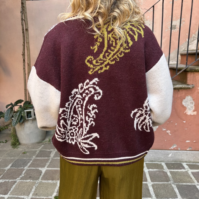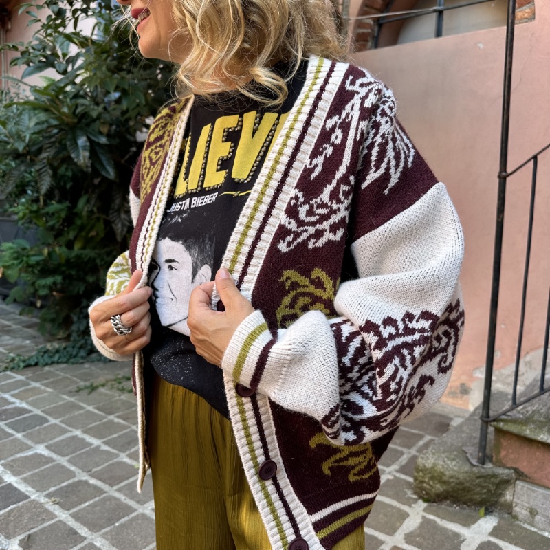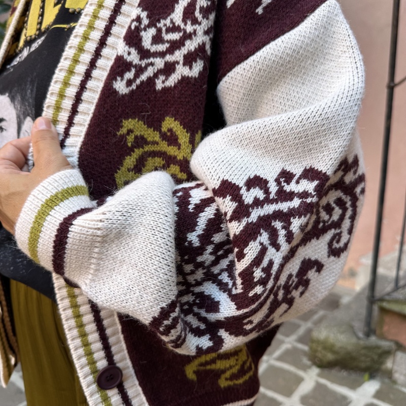 Cardigan in maglia , modello fantasia con allacciatura centrale