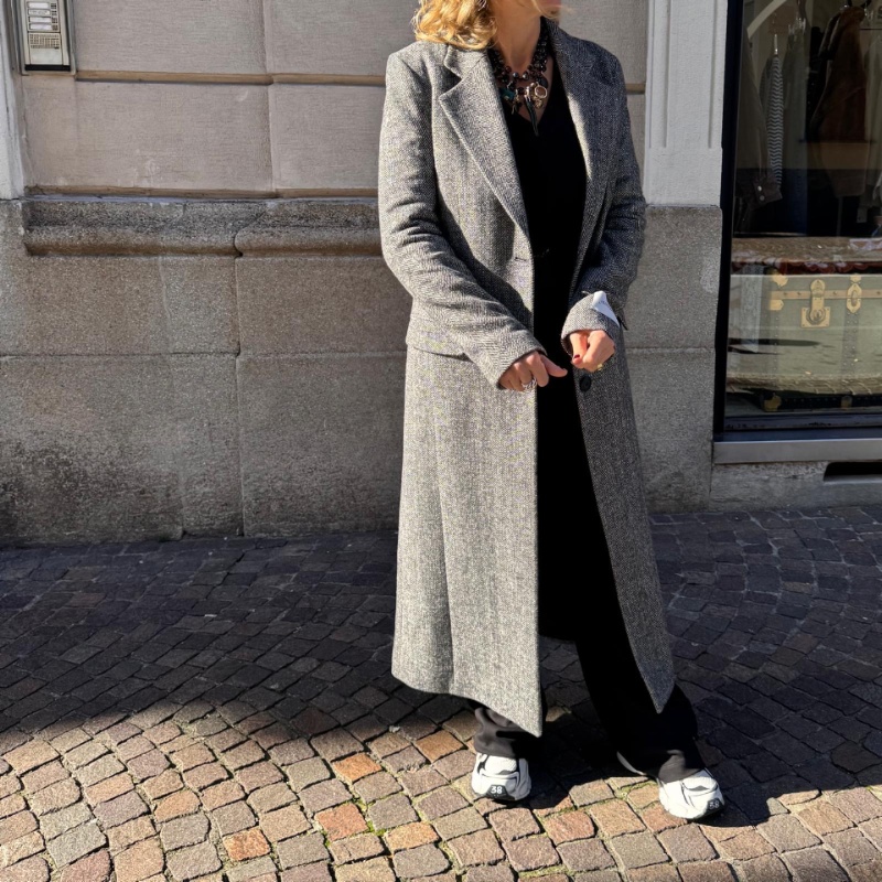 Cappotto lungo spigano, modello sciancrato, monopetto con fodera interna e tasche laterali