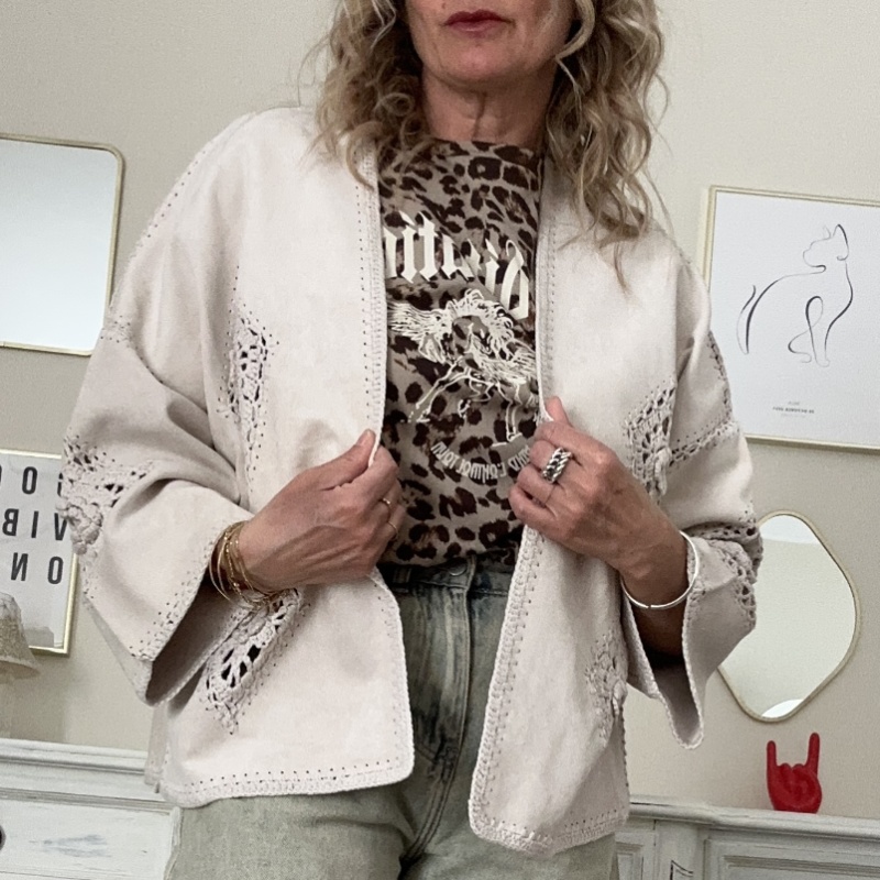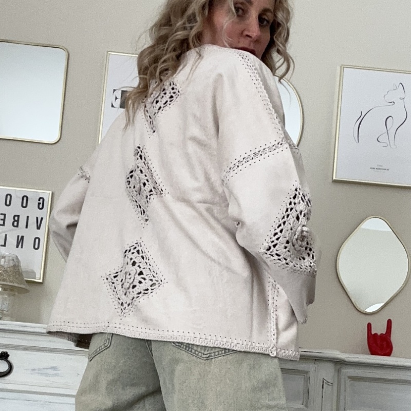 Giacchina in simil dainetto, modello a scatolina con spalla scesa ed inserti ricamati