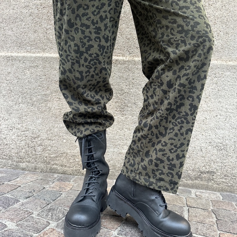 Pantalone in velluto con stampa animalier, elastico in vita, tasche laterali