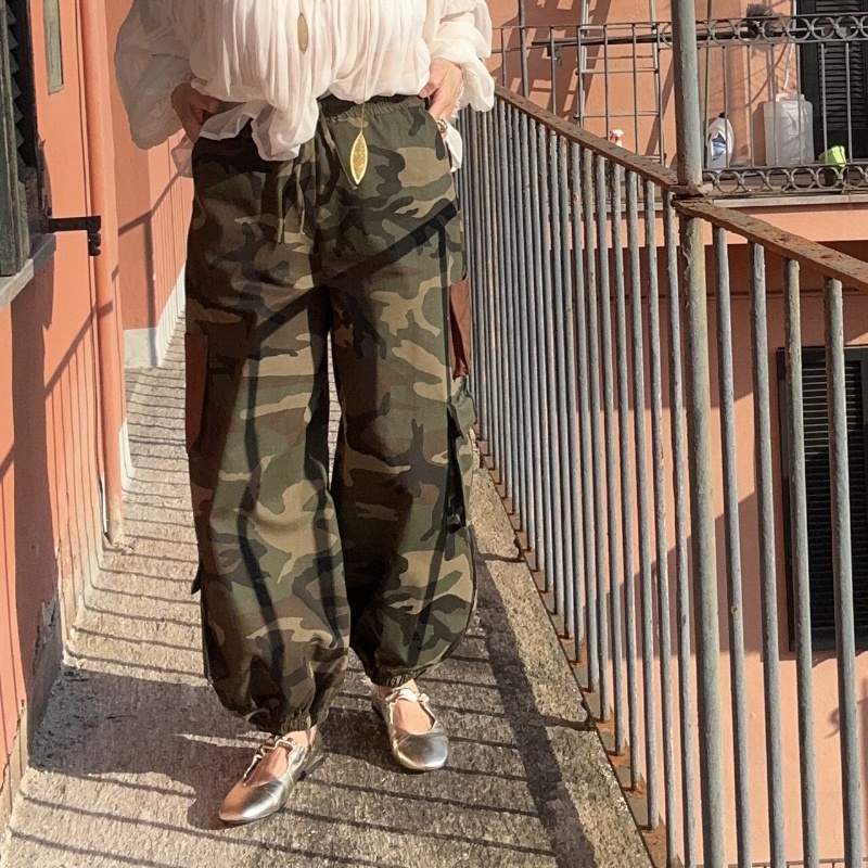 Pantalone militare, modello cargo con elastico in vita, tasche applicare ed elastico sul fondo
