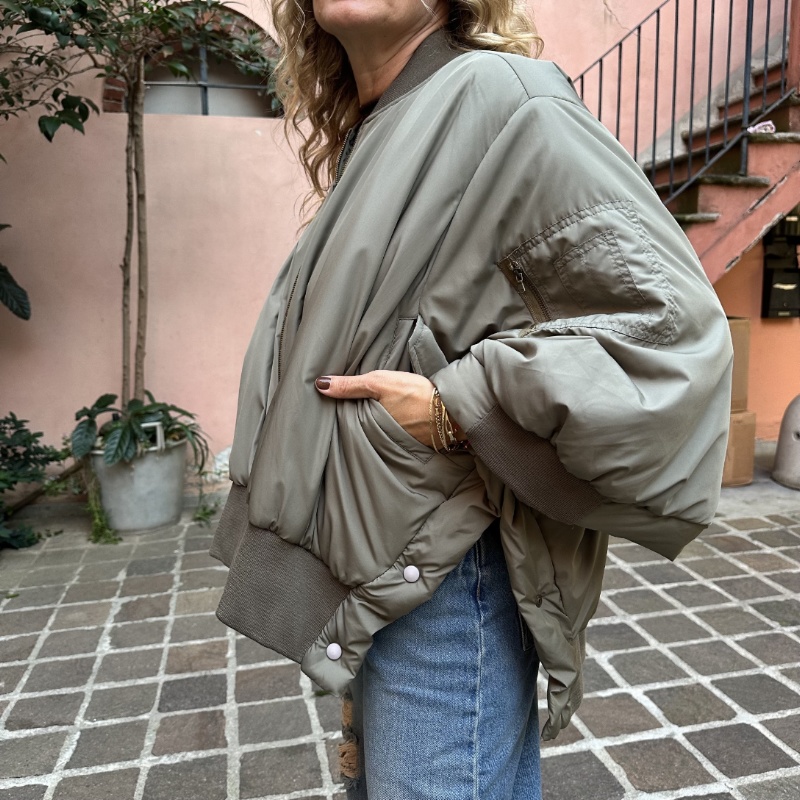 Bomber asimmetrico, modello over con manic aa pipistrello, spalla scesa e bottoni automatici su entrambe i lati, tasche e fodera interna a contrasto