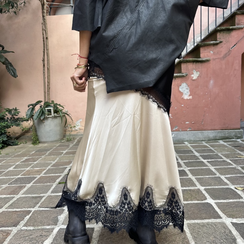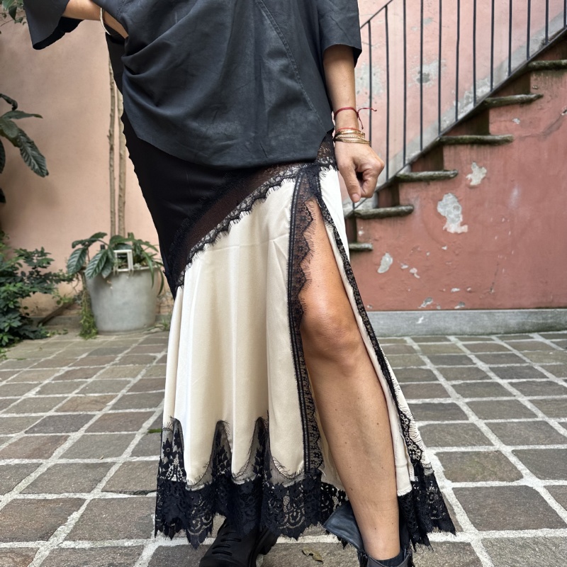 Gonna in raso con elastico in vita, spacco laterale ed inserti in pizzo
