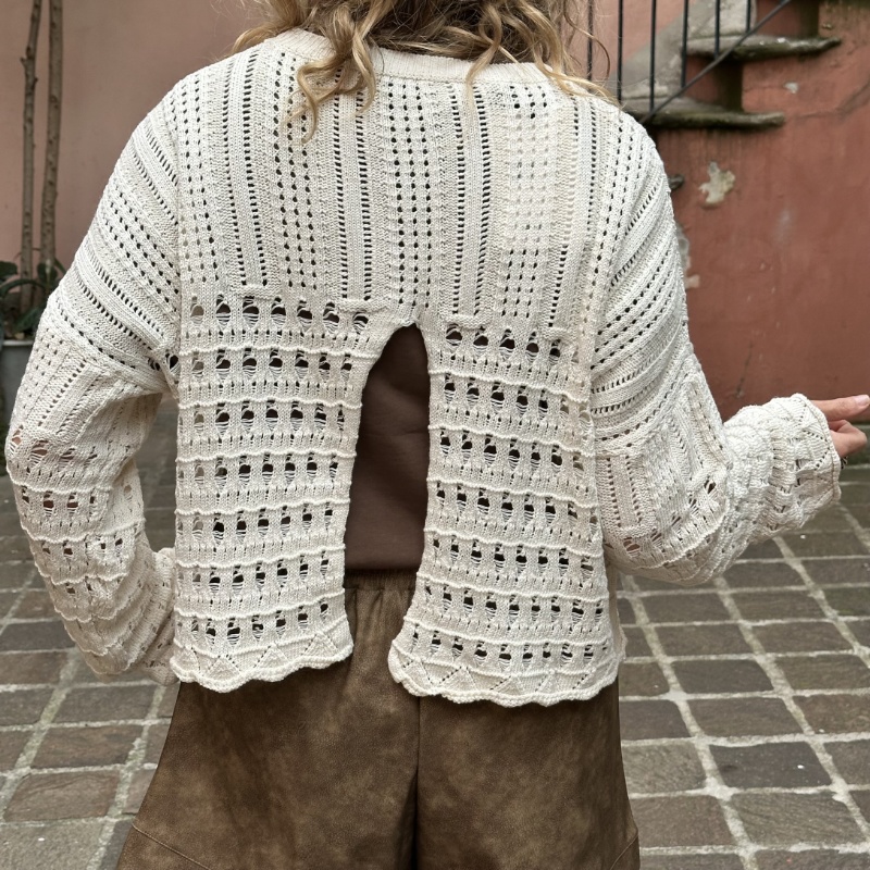 Maglioncino aperto dietro, modello a girocollo con taglio a scatoletta e spalla scesa