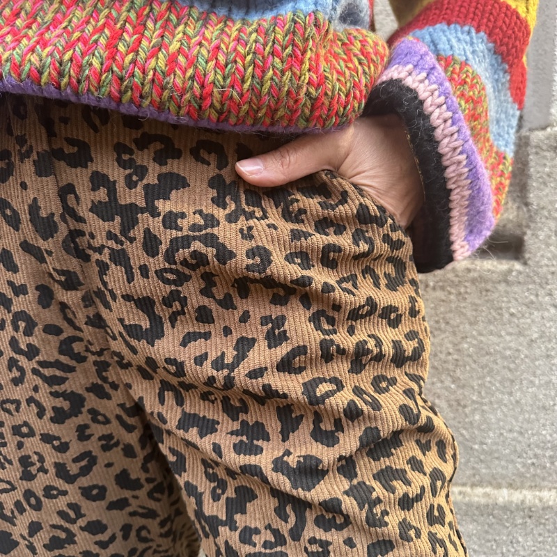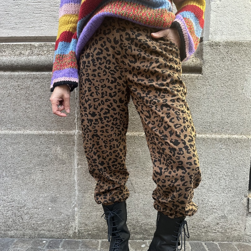 Pantalone in velluto con stampa animalier, elastico in vita, tasche laterali
