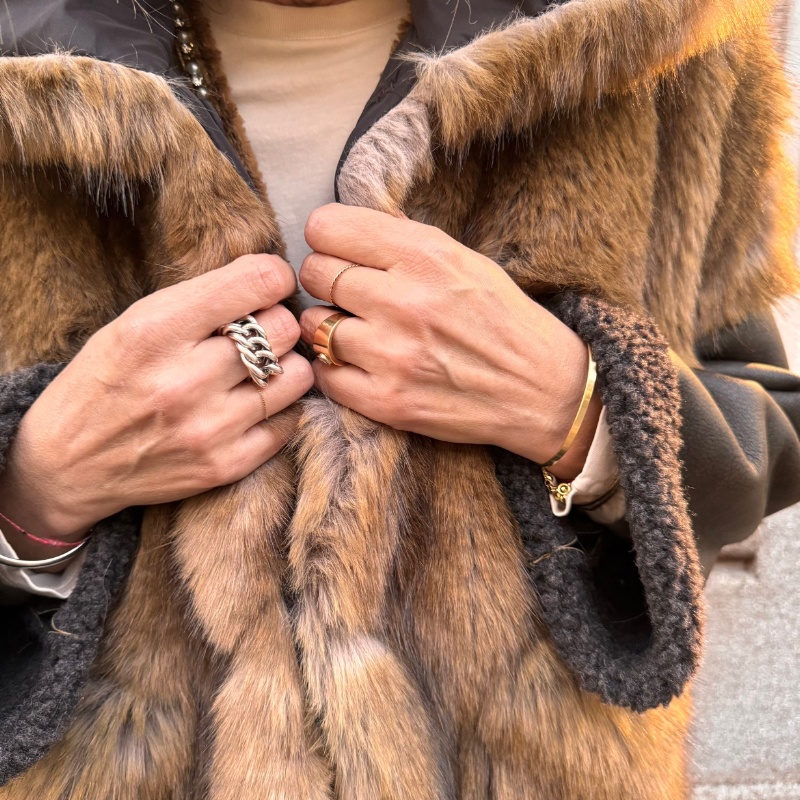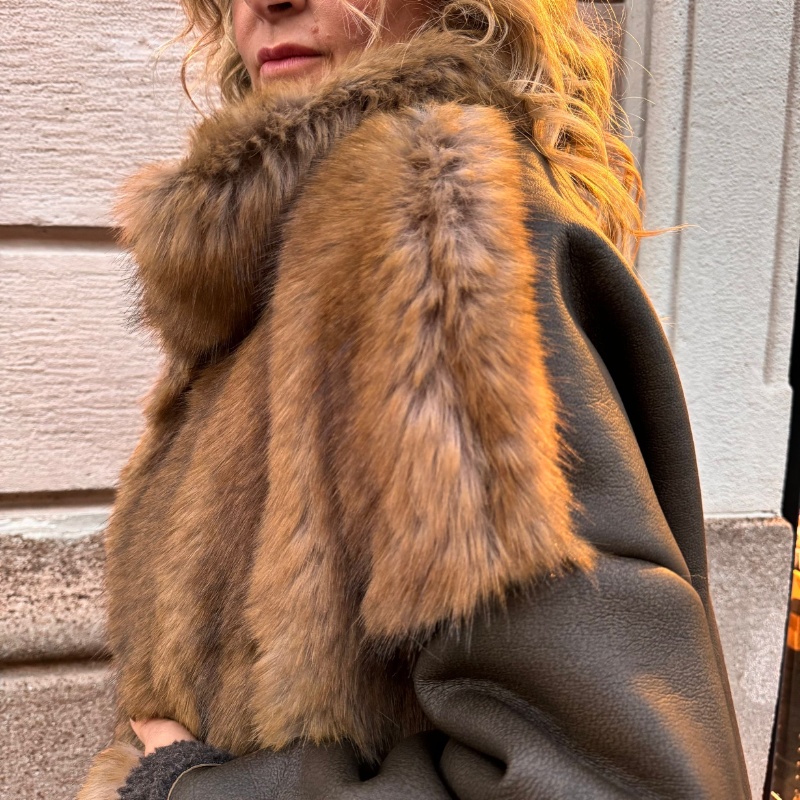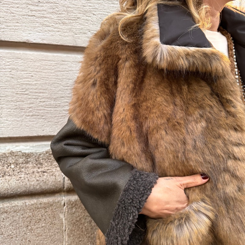 Ecopelliccia con taglio a trapezio, modello asimmetrico con tasche applicate, maniche in montone e retro in montone , allacciatura centrale con automatici