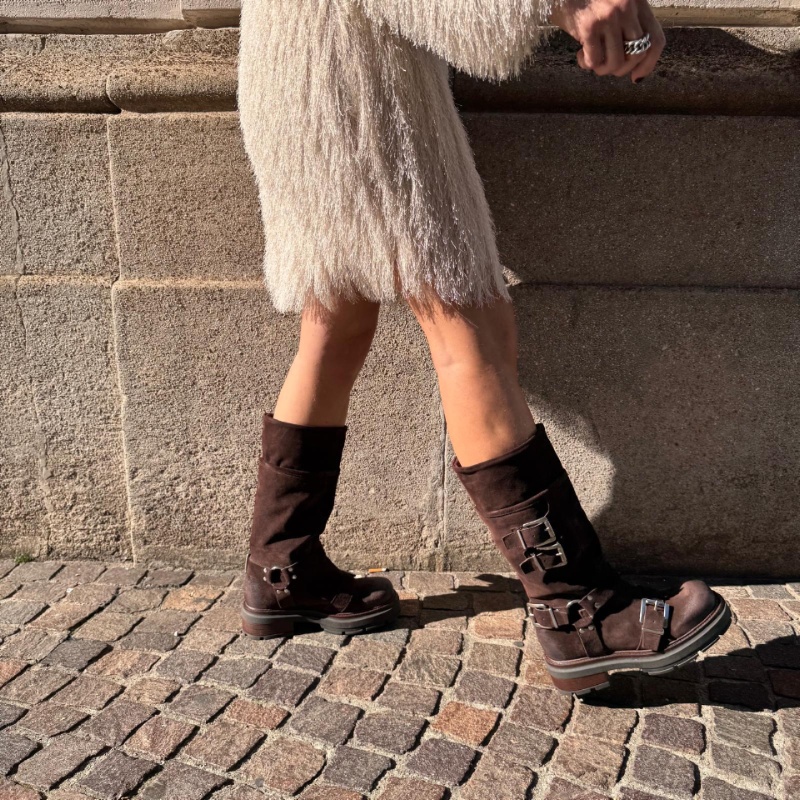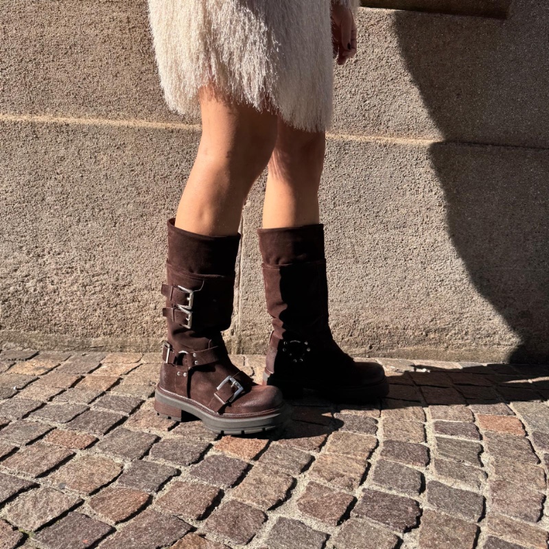 Stivale scamosciato con fondo in gomma, fibbie laterali argentate , punta e tallone effetto spazzolato vintage