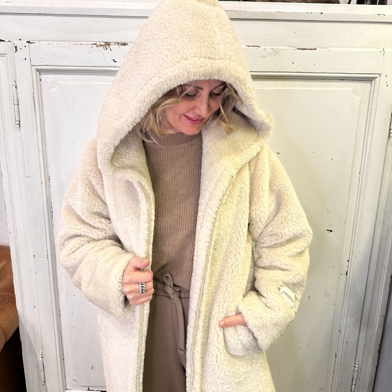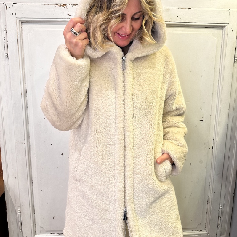 Cappotto teddy con chiusura a zip, maxi cappuccio e tasche laterali