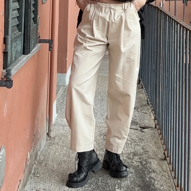 Pantalone in cotone , modello con elastico in vita, tasche laterali , choisura con zip sul fianco