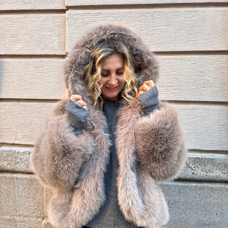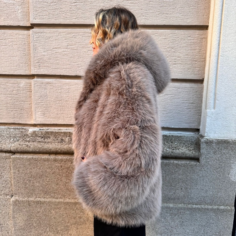 Ecopelliccia dal pelo morbidissimo, modello asimmetrico e stondato sul fondo, tasche laterali, cappuccio, allacciatura centrale con automatici