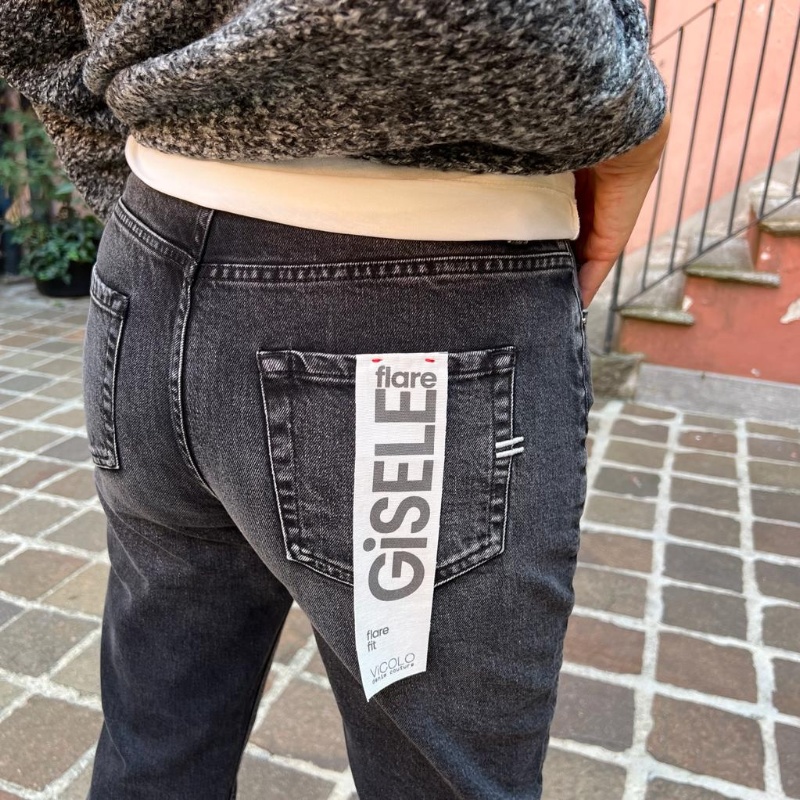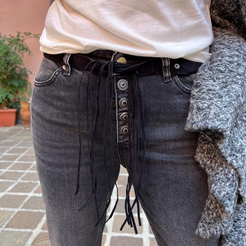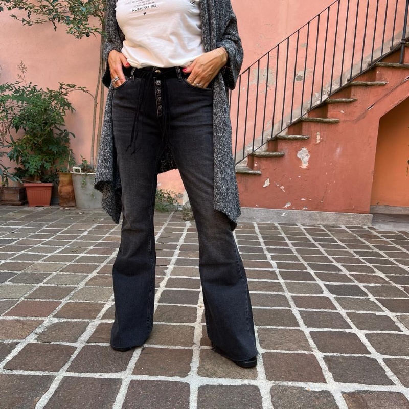 Jeans continuativo a vita media con bottoni gioiello, leggermente elasticizzato a zampa sul fondo con taglio vivo