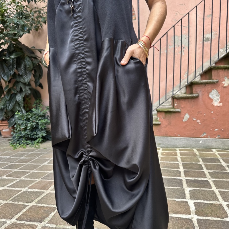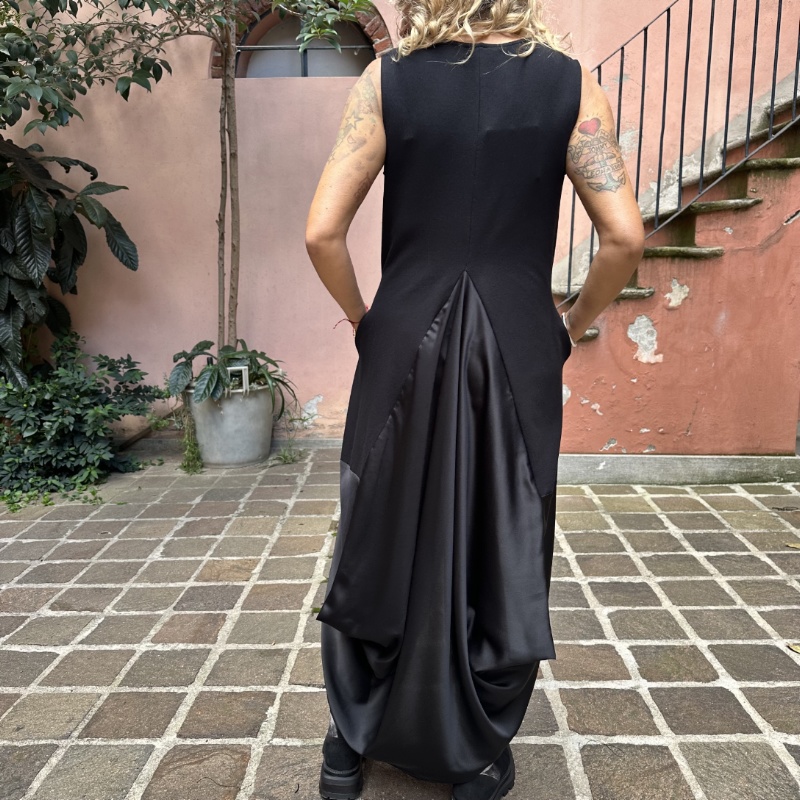 Abito smanicato asimmetrico in doppio tessuto con coulisse