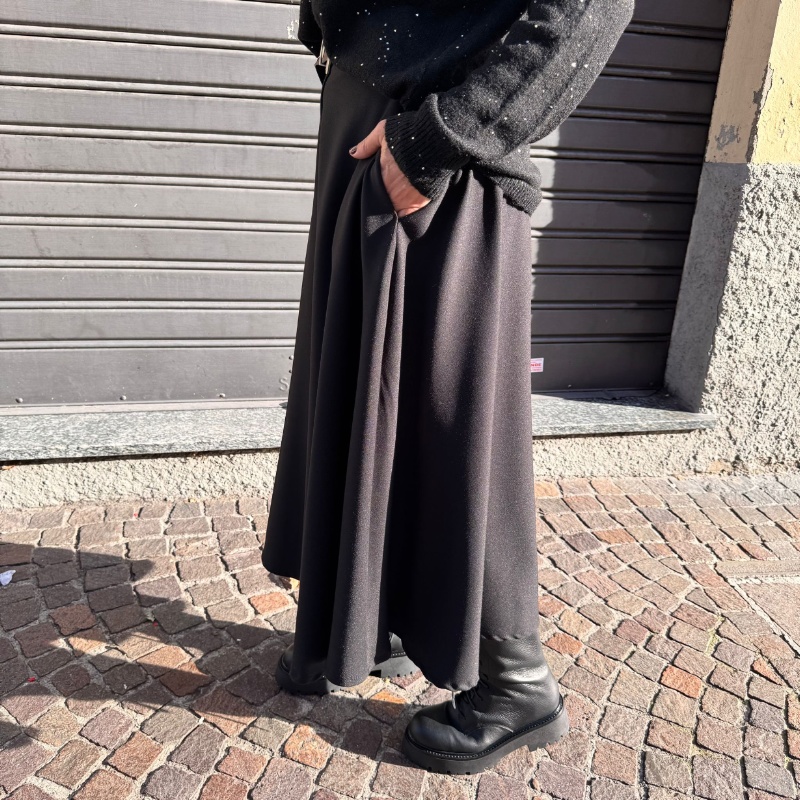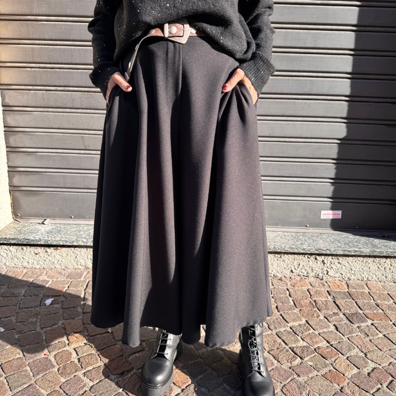 Pantalone a gamba larga con cavallo leggermente sceso, tasche laterali, accessorio incluso
