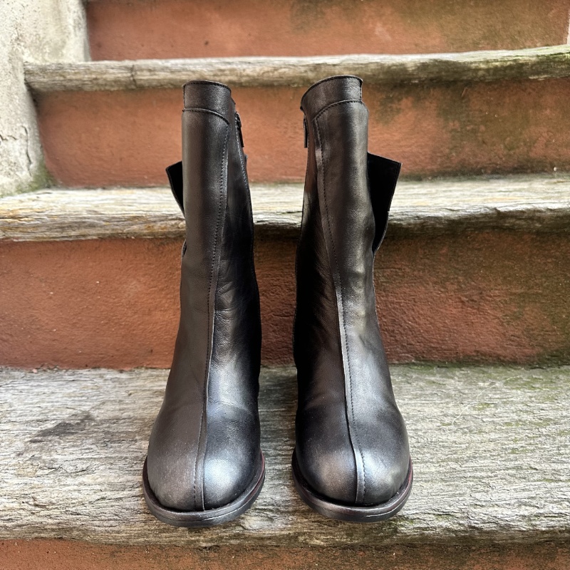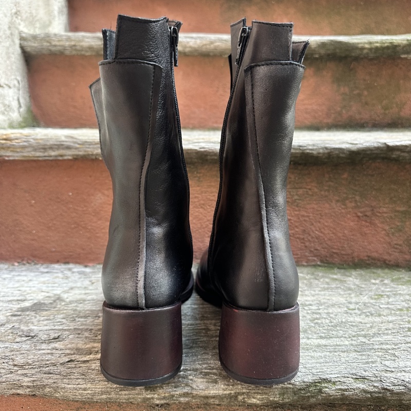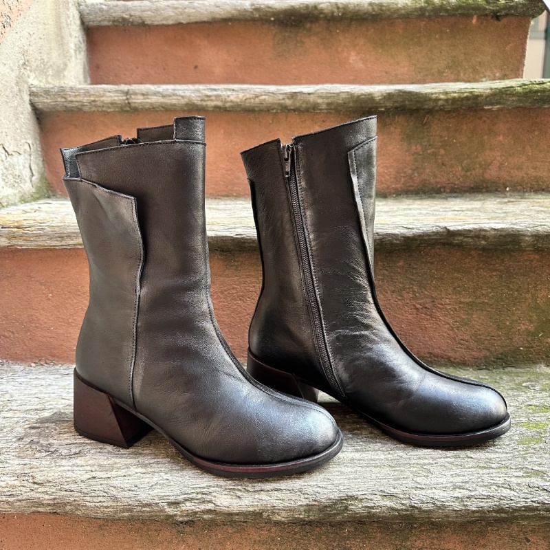 Tronchetto in vera pelle spalmata , black silver, calzatura realizzata artigianalmente, tacco largo, comodissimo altezza 6, punta stondata , zip laterale