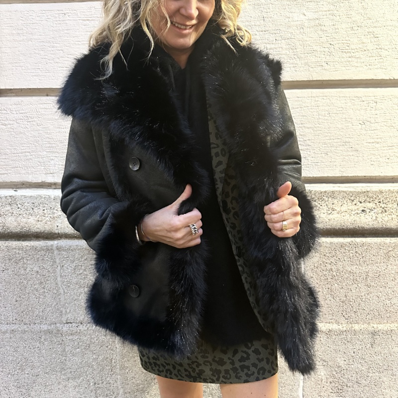 Ecopelliccia reversibile, da un lato morbidissimo pelo e dallaltro effetto montone, allacciatura con bottoni, tasche laterali da entrambe i lati