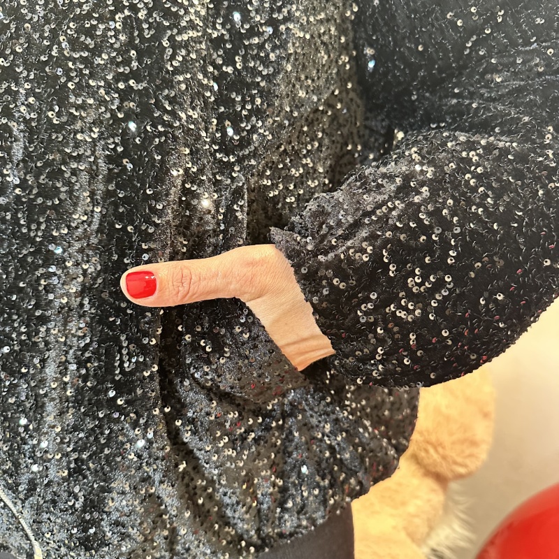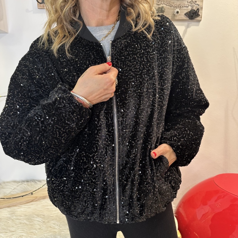 Bomber con paillettes base in velluto foderato, colletto in maglia, elastico sul fondo e polsini, tasche sul davanti, zip centrale