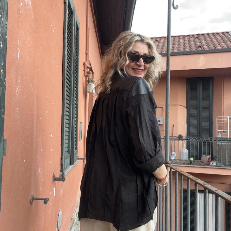 Camicia over in lino con inserti in pelle , taglio vivo sul fondo