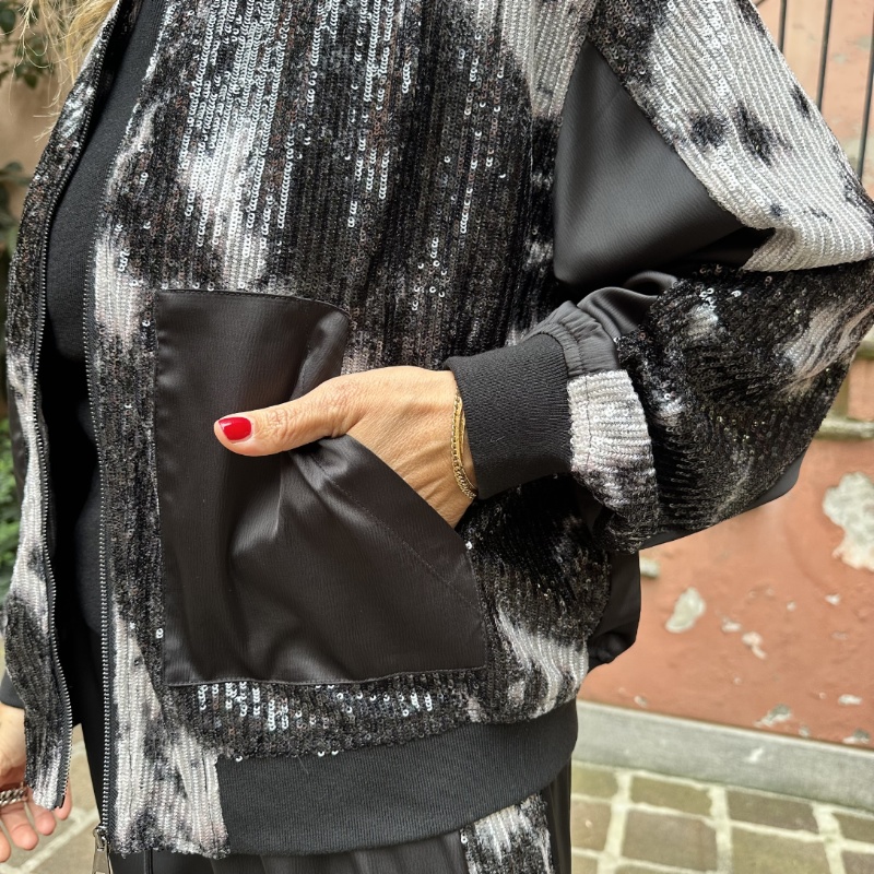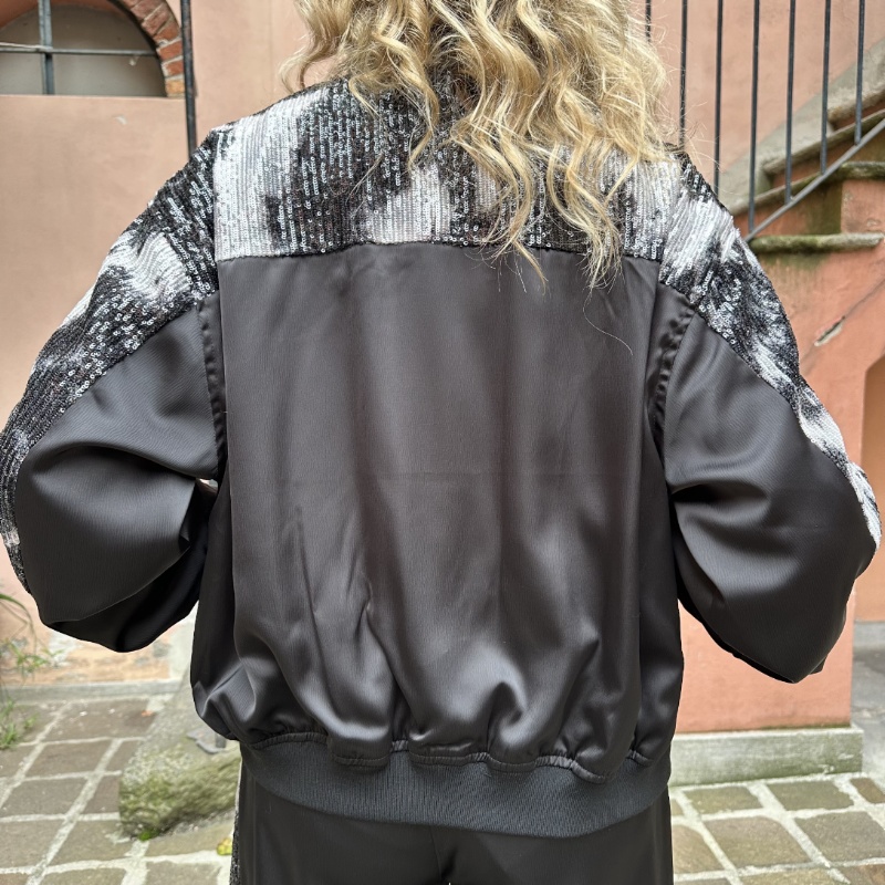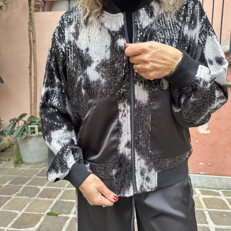 Bomber in micropailettes maltinto, zip centrale tasche laterali, elastico sul fondo