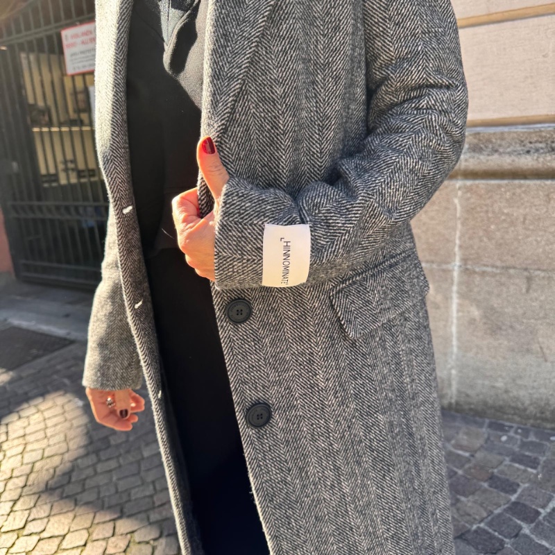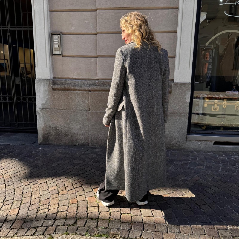 Cappotto lungo spigano, modello sciancrato, monopetto con fodera interna e tasche laterali