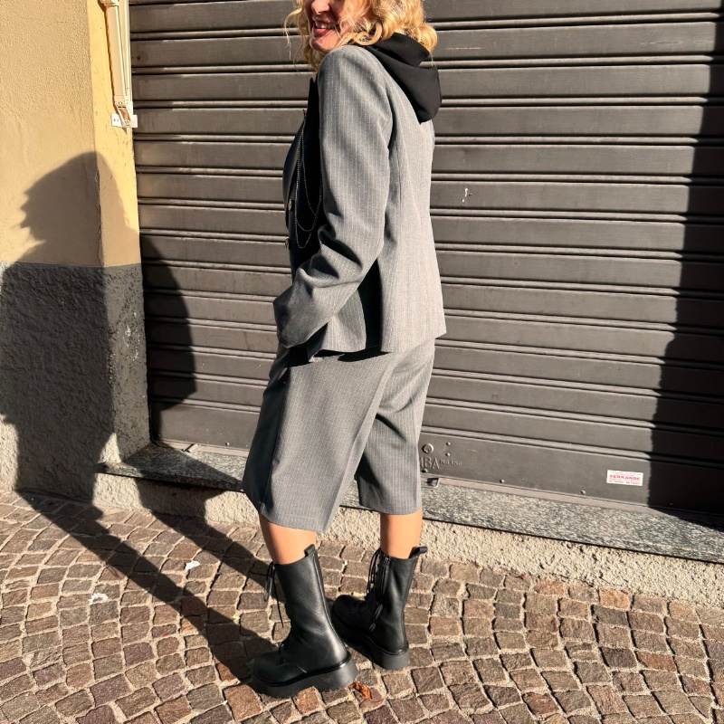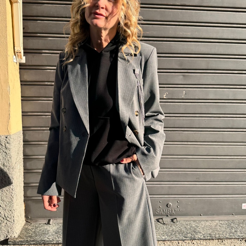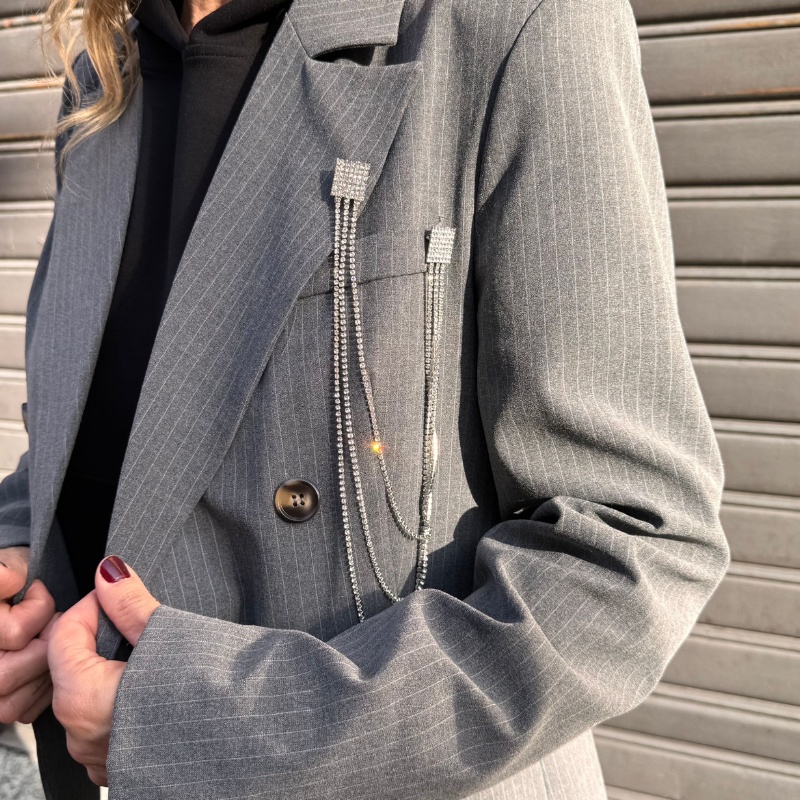 Giacca gessata, modello doppiopetto con fodera interna e spilla gioiello lato cuore, spacchetto sul fondo