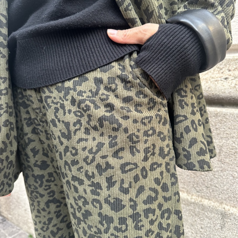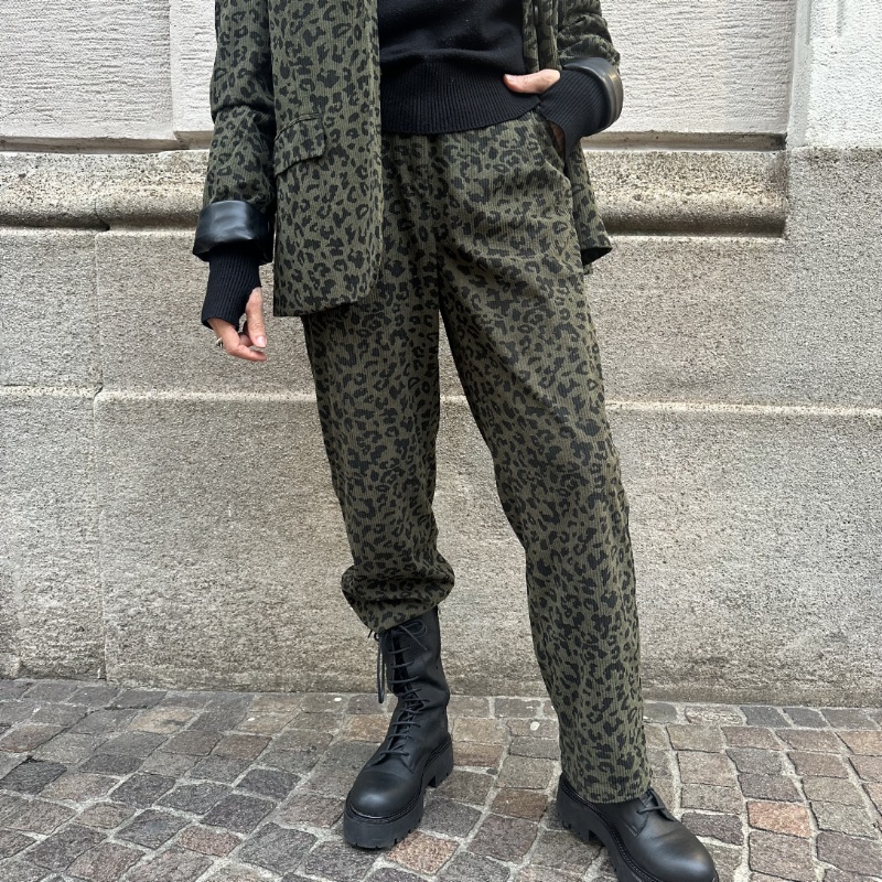 Pantalone in velluto con stampa animalier, elastico in vita, tasche laterali