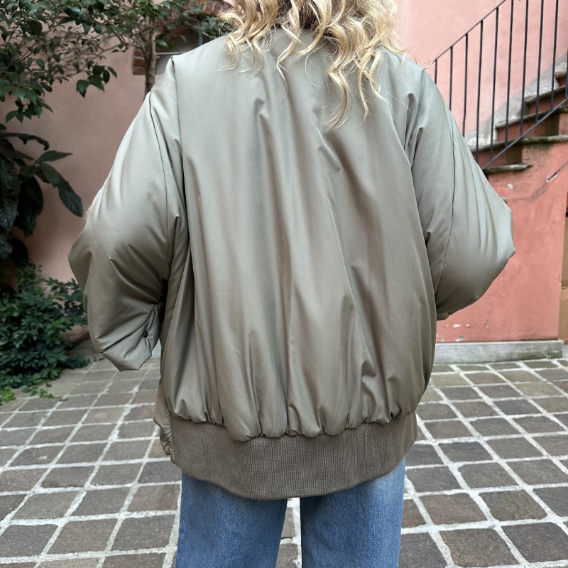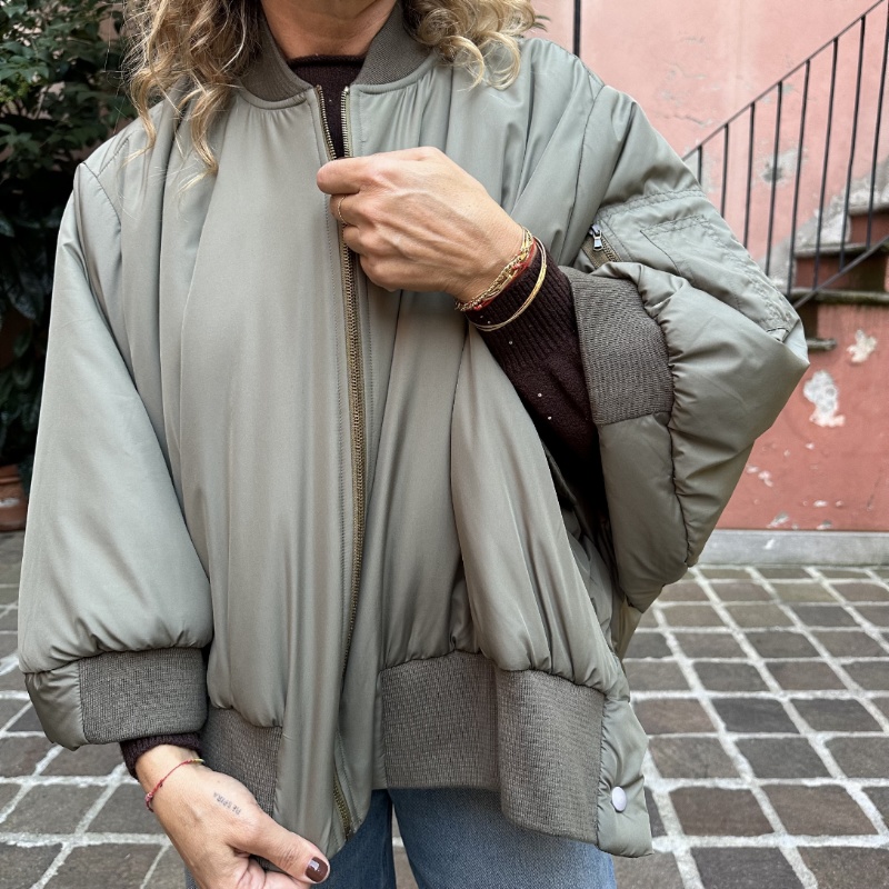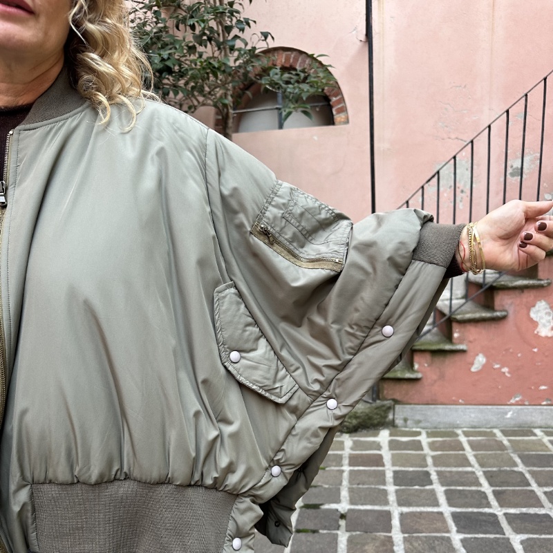 Bomber asimmetrico, modello over con manic aa pipistrello, spalla scesa e bottoni automatici su entrambe i lati, tasche e fodera interna a contrasto