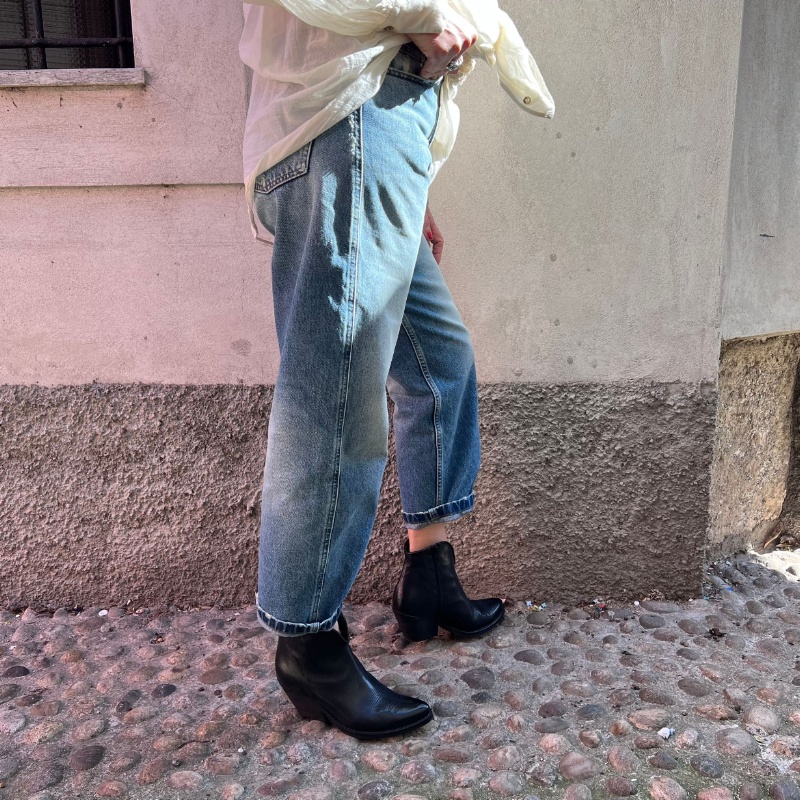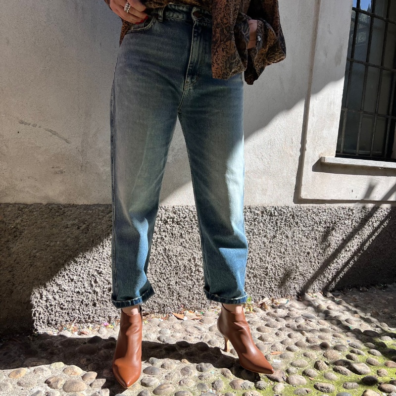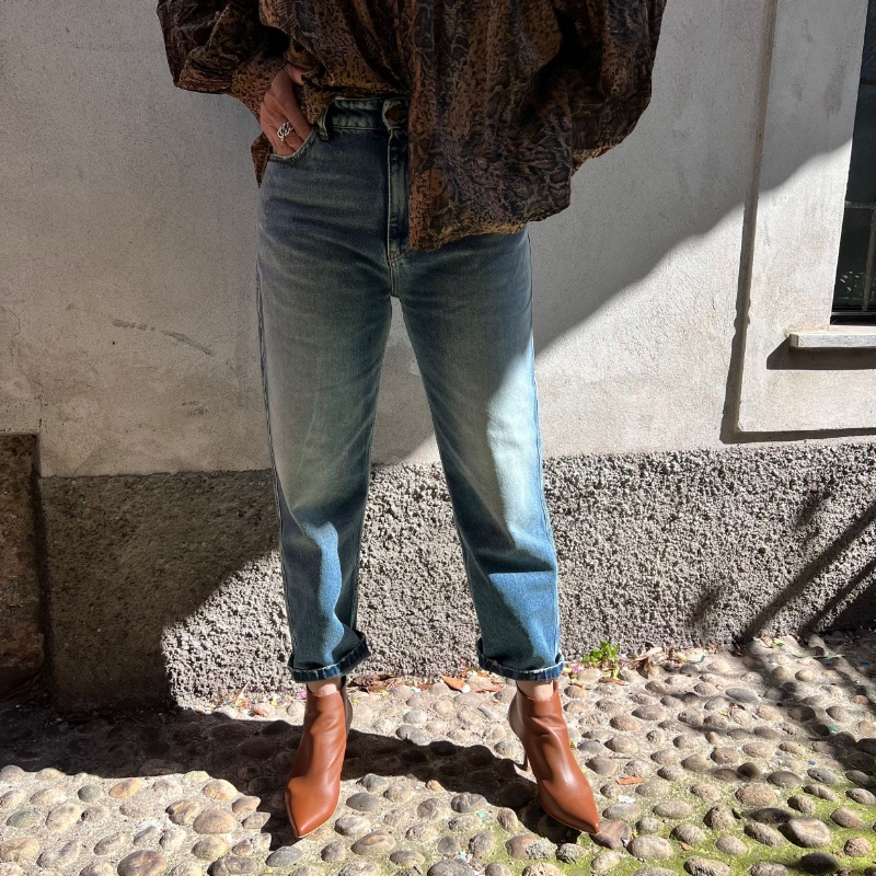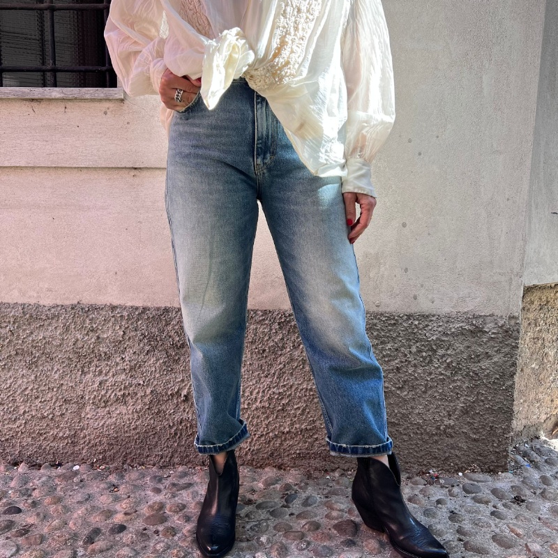 Jeans modello best seller, tasche laterali e tasche applicate sul retro, chiusura con bottone e zip.
