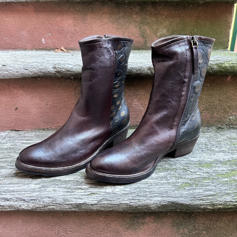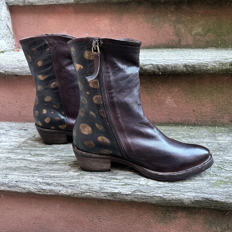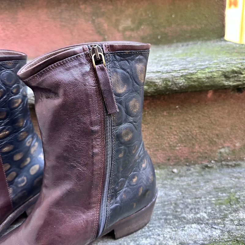 Tronchetto in vera pelle, modello artigianale con zip interna , punta stondata parte posteriore stampa cocco laminata, fondo in cuoio