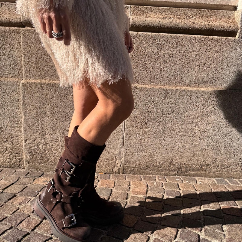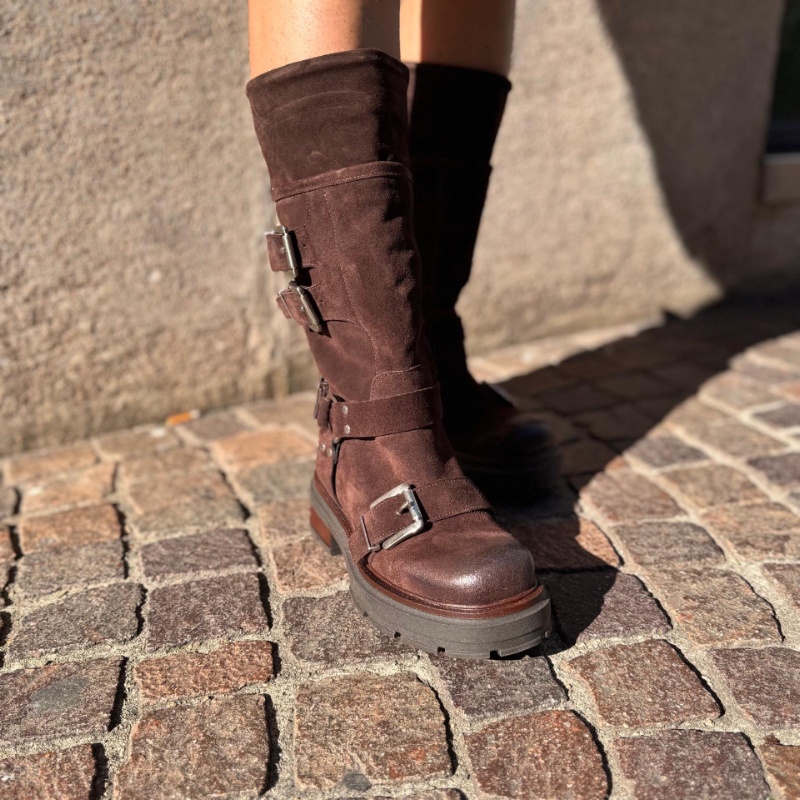 Stivale scamosciato con fondo in gomma, fibbie laterali argentate , punta e tallone effetto spazzolato vintage