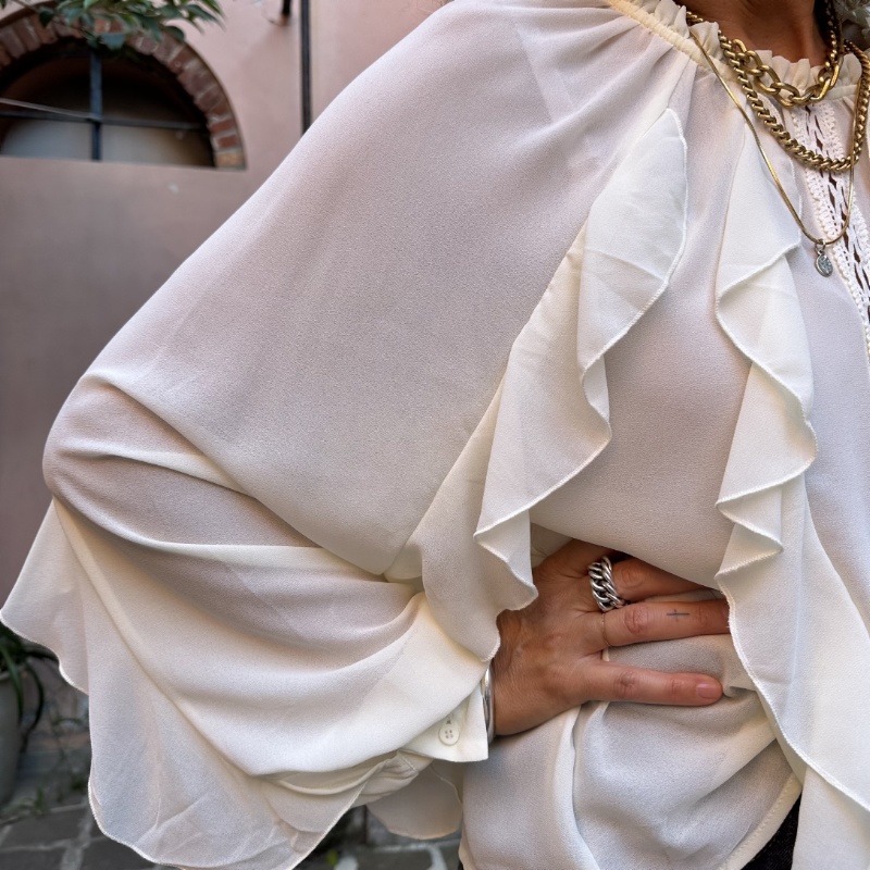Blusa con rouche e voilant, chiusua sul retro con bottoncino, manica ampia