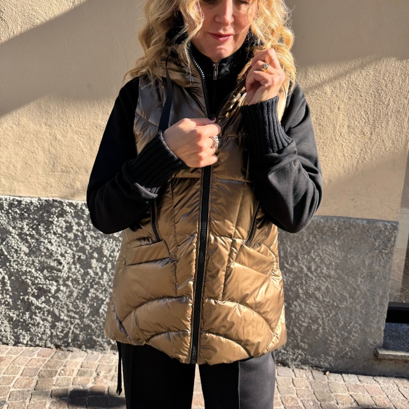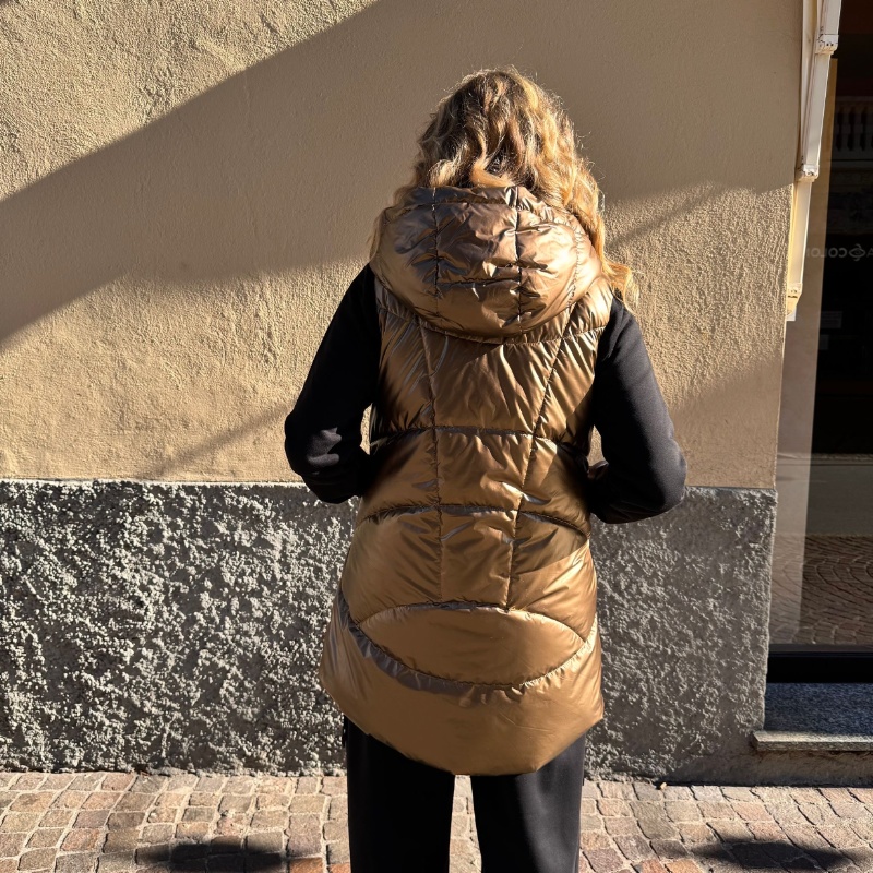 Piumino smanicato, modello asimmetrico con zip imbrunita, cappuccio e tasche laterali