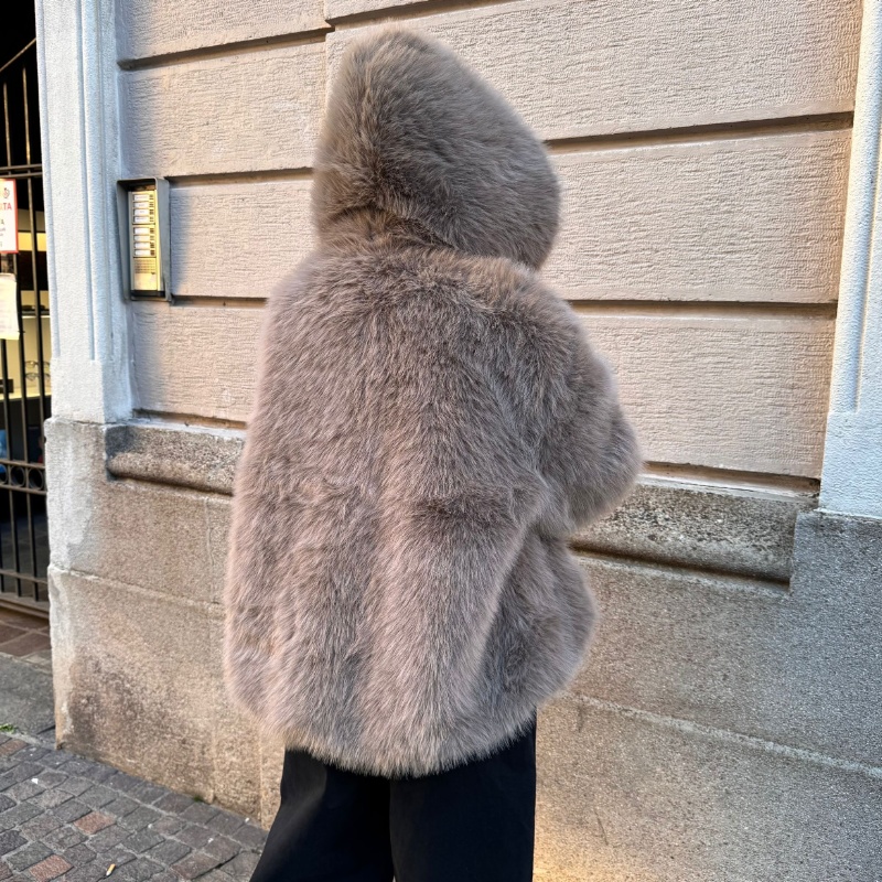 Ecopelliccia dal pelo morbidissimo, modello asimmetrico e stondato sul fondo, tasche laterali, cappuccio, allacciatura centrale con automatici