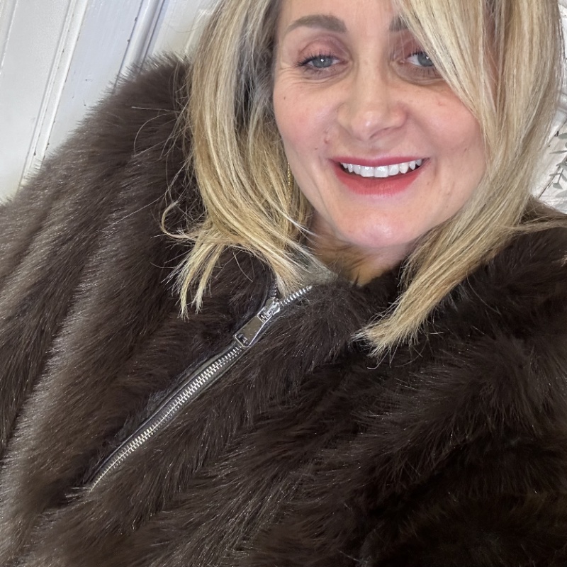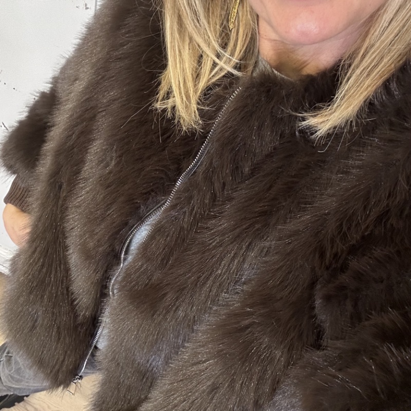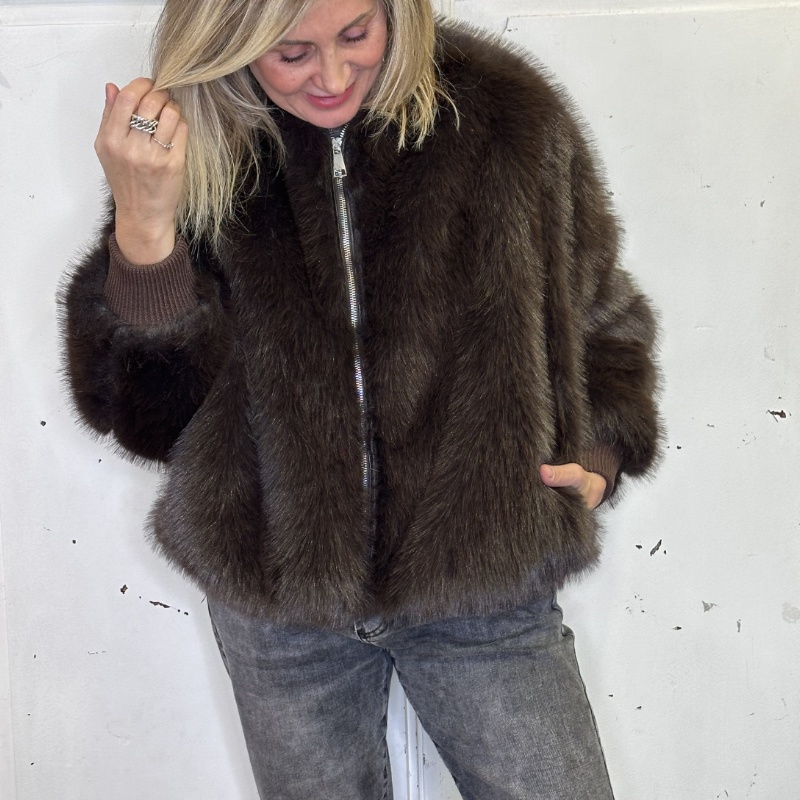 Ecopelliccia taglio bomber con polsini a costina, tasche laterali, fodera interna chiusura con zip al centro